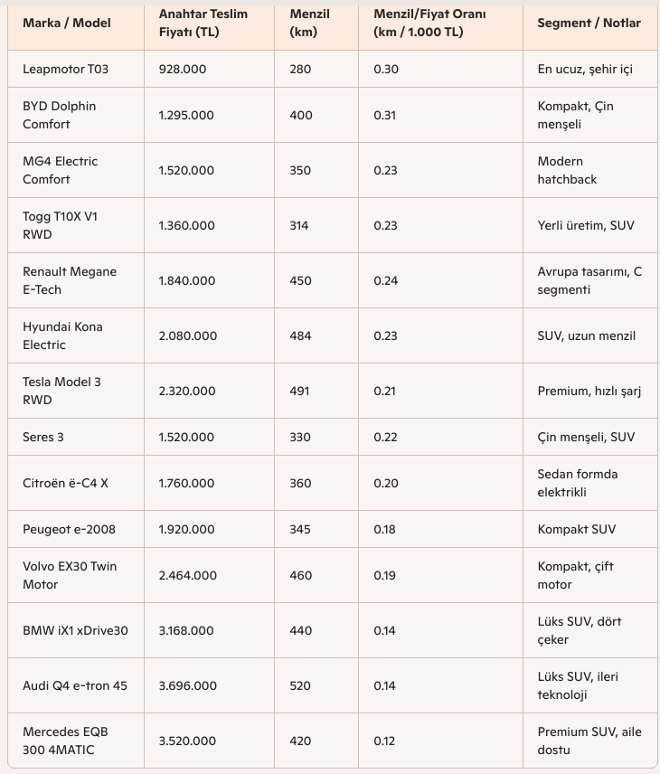 İşte 2025 Ekim itibarıyla Türkiye’de satılan elektrikli araçların menzil/fiyat oranına göre genişletilmiş sıralı tablosu.