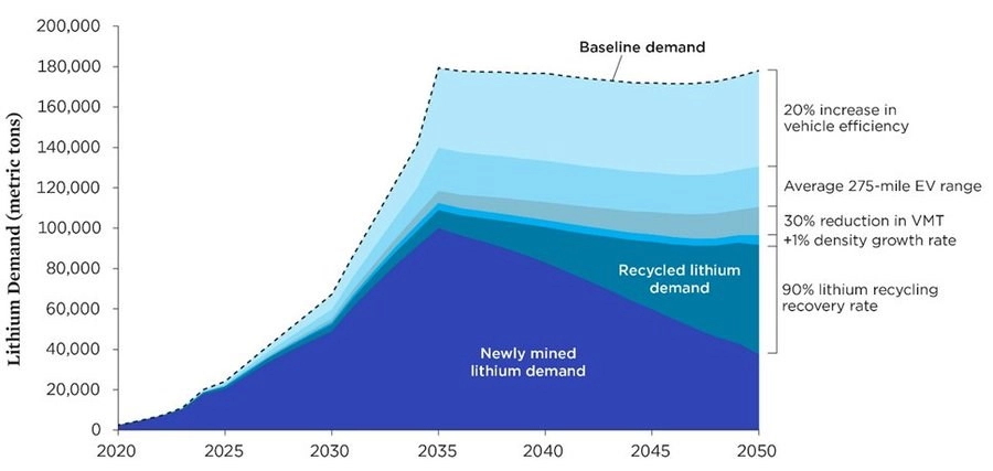 ABD merkezli Union of Concerned Scientists tarafından yapılan analiz, lityum iyon batarya geri dönüşümüne yeterli yatırım yapılması durumunda, 2050’de lityum ihtiyacının %60’ının eski bataryalardan karşılanabileceğini öngörüyor. Bu analiz, 2035 yılında otomobil satışlarının tamamen elektrikliye döndüğü ve lityum iyon bataryaların %90 oranında geri dönüştürüldüğü bir senaryoyu temel alıyor. Bu senaryoda, 2050’de lityum madenciliğine olan gereksinim 2035’te ulaşılacak zirvenin yarısına gerileyebilir.