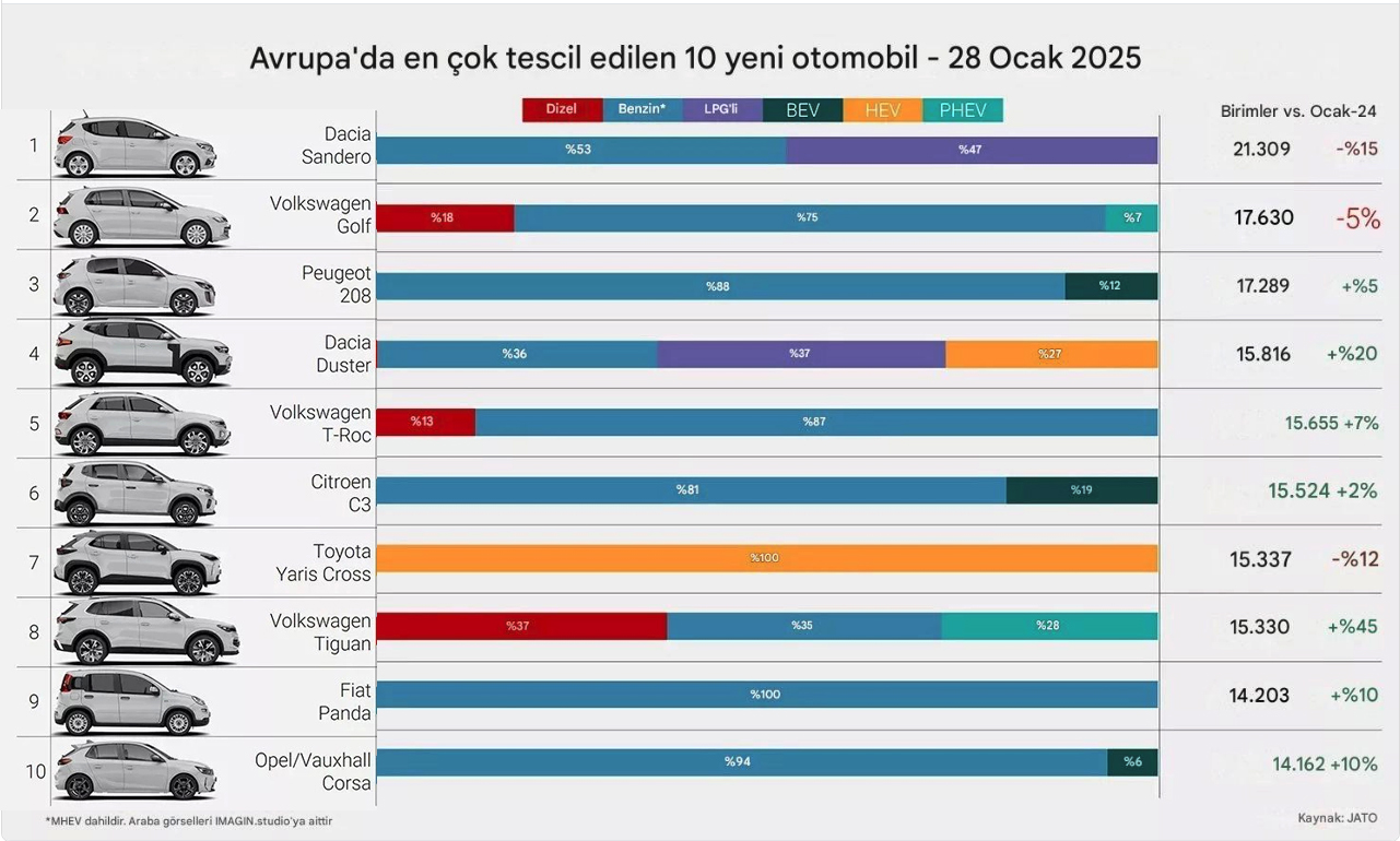 Avrupa’da elektrikli araç satışları artıyor olsa da, içten yanmalı modeller hala revaçta. Kıta genelinde en çok satan model, 21.309 adet satışla Dacia Sandero olurken, Volkswagen Golf (17.630) ve Peugeot 208 (17.289) onu takip etti. Bu durum, elektrikli araçların henüz içten yanmalı motorlu araçların yerini tam anlamıyla alamadığını gösteriyor.