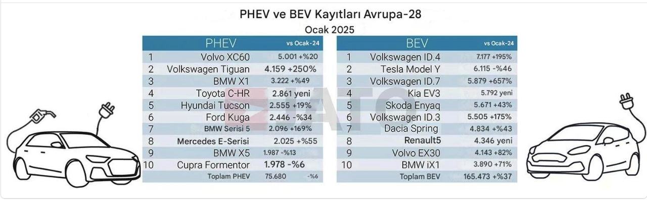 İlginç bir şekilde, şarj edilebilir hibrit araçların (PHEV’ler) satışları Ocak ayında %6 düşüş gösterdi. Volvo XC40, 5.001 adetlik satışla PHEV yarışına öncülük ederken, onu Volkswagen Tiguan (4.159) ve BMW X1 (3.222) takip etti. Bu düşüş, tüketicilerin tamamen elektrikli araçlara yönelmeye başladığının bir göstergesi olabilir. Volkswagen’in başarısı, şirketin elektrikli araç teknolojisine yaptığı yatırımların bir sonucudur. Örneğin, ID.4 modeli, geniş iç hacmi, uzun menzili ve hızlı şarj özellikleriyle tüketicilerin beğenisini kazanmıştır. Ayrıca, Volkswagen’in elektrikli araç üretiminde kullandığı modüler elektrik platformu (MEB), şirketin farklı modellerde yüksek verimlilik ve düşük maliyetle üretim yapmasını sağlamaktadır.